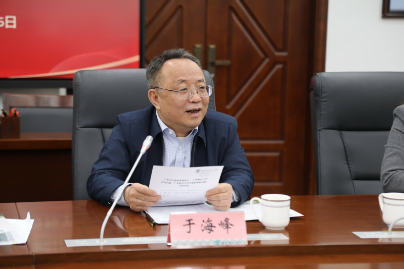 于海峰首先对王义平一行表达了热烈欢迎,并逐一介绍出席嘉宾。他在讲话中提到,一是要通过共建加强注册税务师人才培养,逐步实现完整的培养链条,要优化培养方案,发挥协会在实习实训等方面的积极作用,提升学生实践能力。二是加强税务师从业人员培训,针对在职人员,开展相适应的继续教育和学历提升,要打造精品课程和项目,加强培训师资建设,通过塑造具有影响力的培训品牌,逐步走向高端化。三是发挥双方优势和区位优势,锚定地方经济社会发展需求,推动产学研合作的特色发展。