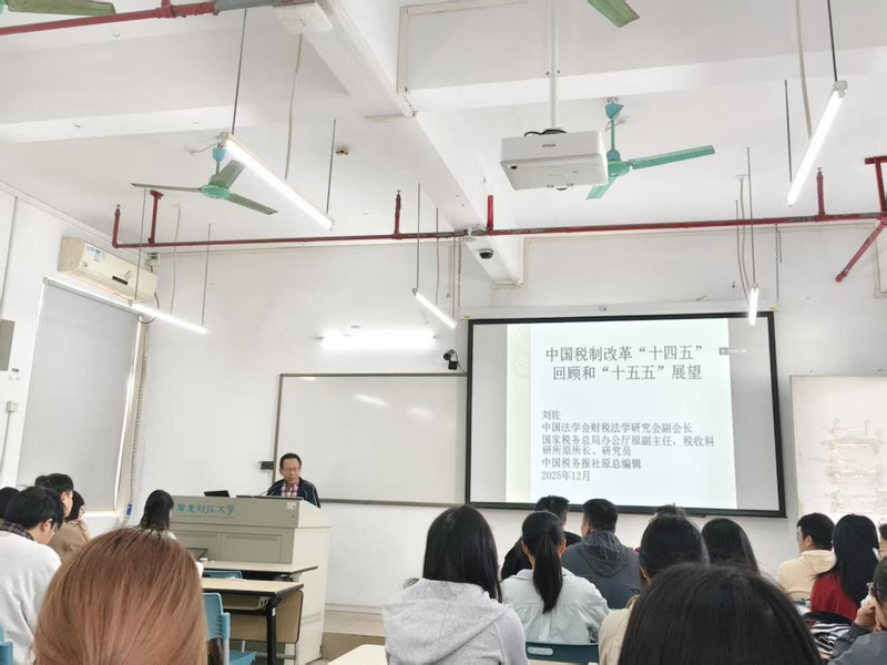 2025年12月9日,中国法学会财税法学研究会副会长刘佐研究员莅临财政税务学院,以“中国税制改革‘十四五’回顾与‘十五五’展望”为题作专题学术讲座。讲座由财政税务学院副院长钱金保主持,院长助理葛立宇、博士研究生、硕士研究生及高级研修班学员通过线上线下相结合的方式参加。